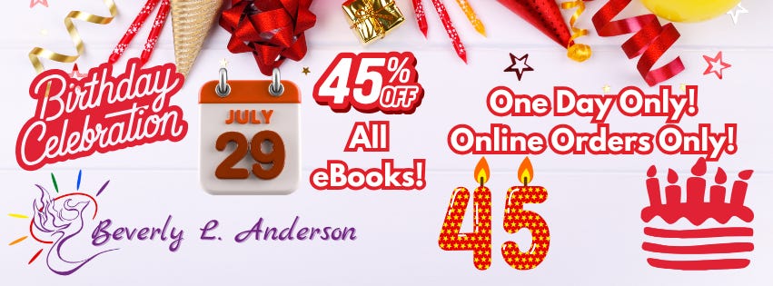 Big sale, on my birthday only! Celebrate turning 45 with me! Buy some books and get some good deals! Please note, these are on ebooks!